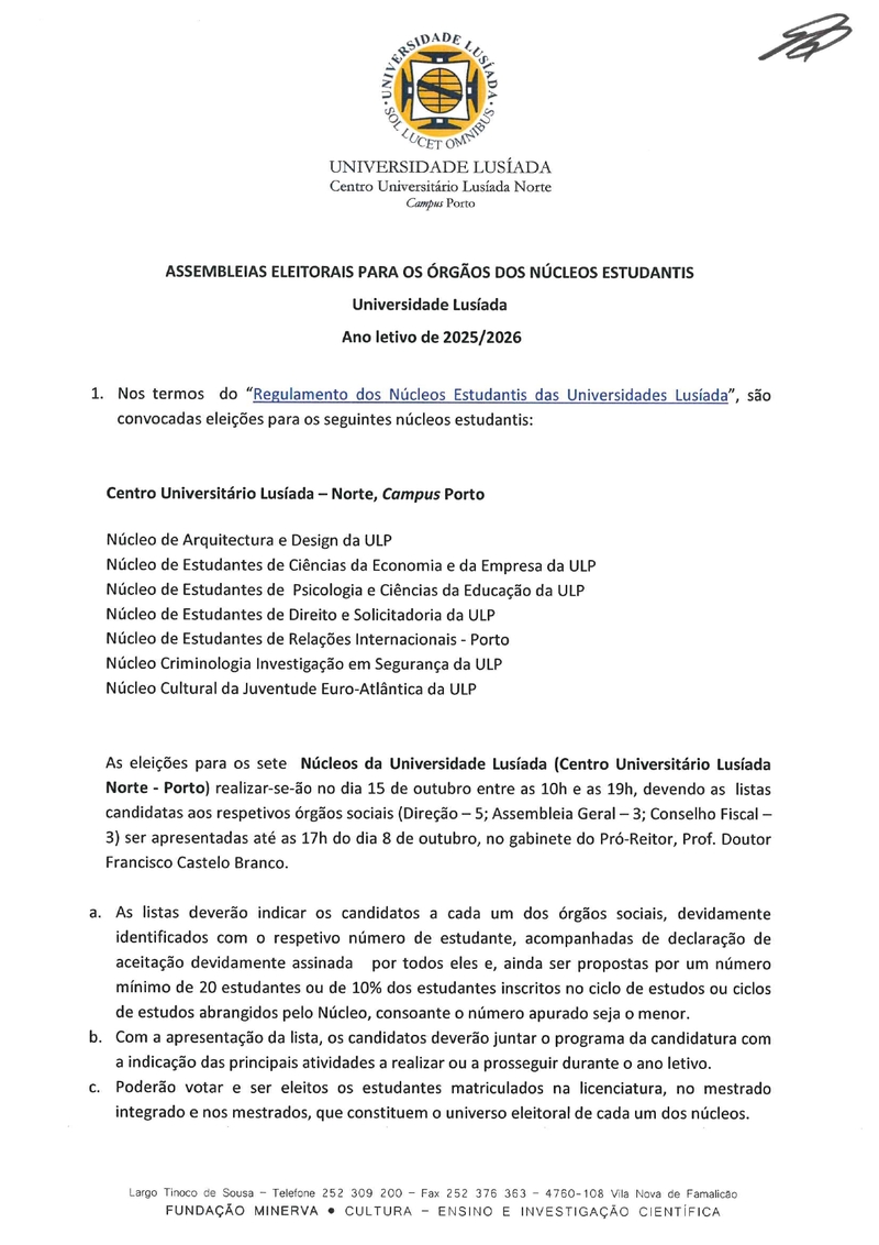 Nos termos do "Regulamento dos Núcleos Estudantis das Universidades Lusíada", são convocadas eleições para os seguintes núcleos estudantis: