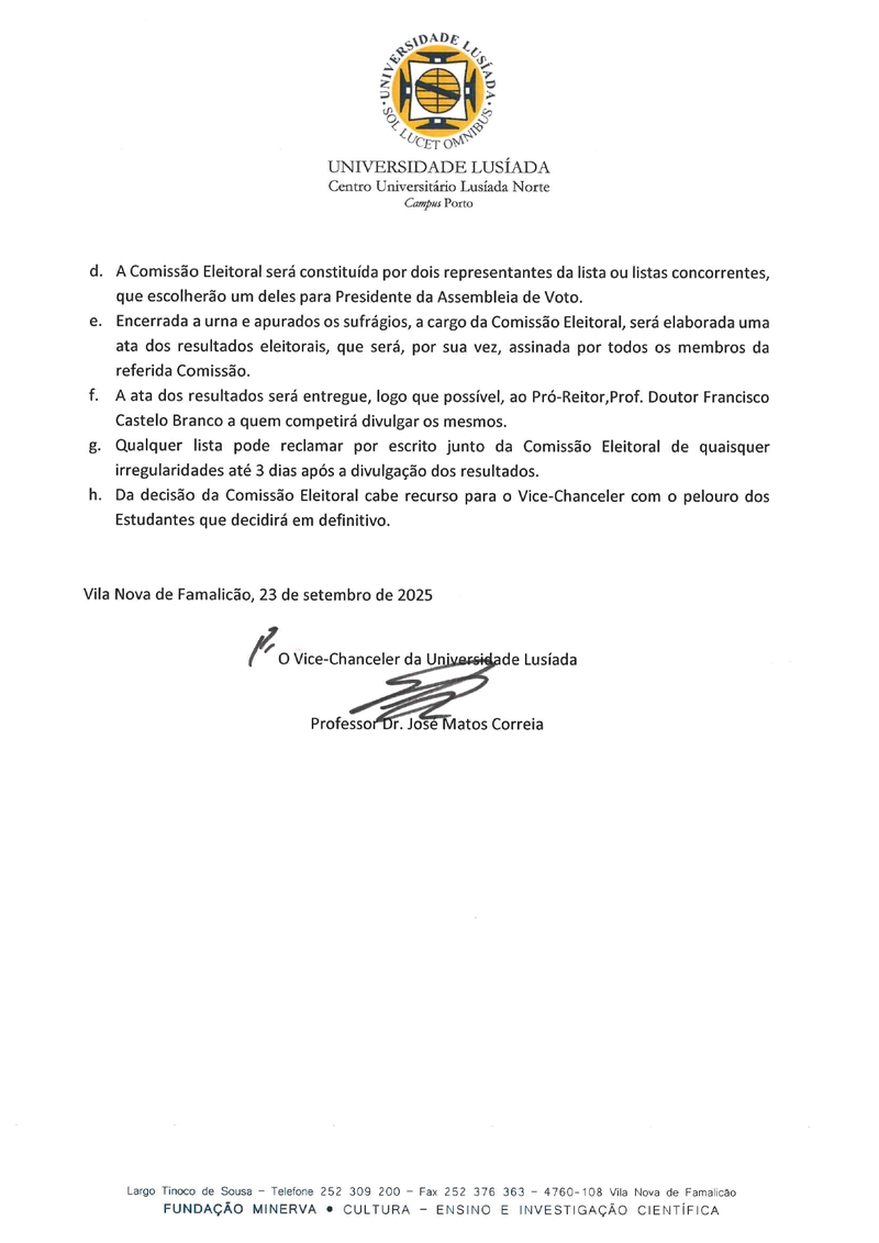 As eleições para os sete Núcleos da Universidade Lusíada (Centro Universitário Lusíada Norte - Porto) realizar-se-ão no dia 15 de outubro, entre as 10h e as 19h, na sala multiusos, devendo as listas candidatas aos respetivos órgāos sociais (Direção – 5; Assembleia Geral - 3; Conselho Fiscal - 3) ser apresentadas até as 17h do dia 8 de outubro, no gabinete do Pró-Reitor, Prof. Doutor Francisco Castelo Branco.