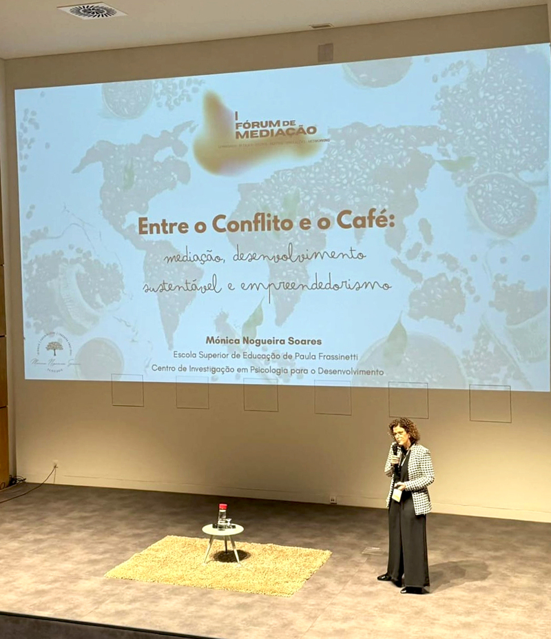 A investigadora falou sobre "Entre o conflito e o café: mediação, desenvolvimento sustentável e empreendedorismo", numa vertente mais humanizada e sustentável na gestão de conflitos, reforçando o papel transformador da mediação em diferentes contextos sociais (comunitário, escolar, familiar, intercultural, organizacional, entre outros).