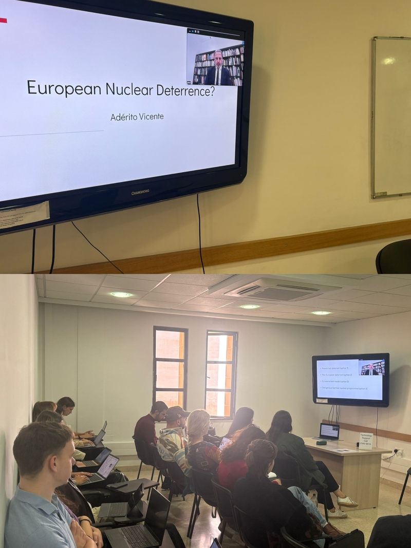 A aula teve como base a sua investigação sobre a necessidade de a Europa desenvolver capacidades próprias de dissuasão nuclear, de forma a reduzir a dependência estratégica em relação aos Estados Unidos, num contexto internacional marcado pelo crescente desafio colocado pelas potências russas e chinesas.