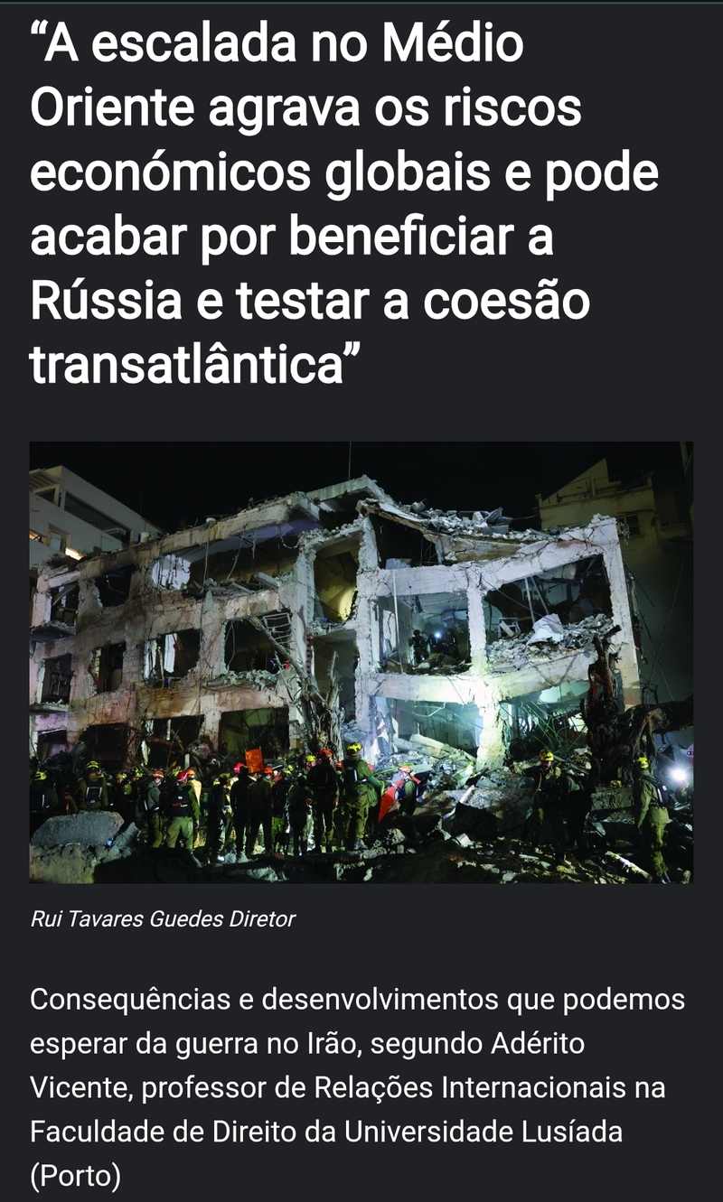 Na entrevista, o Professor Adérito sublinha que este conflito já ultrapassa uma dimensão estritamente regional, produzindo impactos económicos significativos à escala global, colocando à prova a coesão transatlântica e abrindo potenciais oportunidades estratégicas para atores como a Rússia, no contexto de uma ordem internacional em transição.