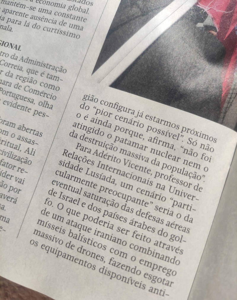 O Professor Doutor Adérito Vicente, Docente de Relações Internacionais da Faculdade de Direito da Universidade Lusíada, no Porto, e Investigador do CEJEIA, foi convidado pelo Diretor da Revista Visão, Rui Tavares Guedes, para analisar a guerra no Irão, as suas implicações e os potenciais cenários de agravamento.